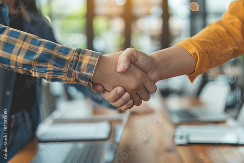 © Sandu, Obraz premium Two people shaking hands in front of a laptop computer