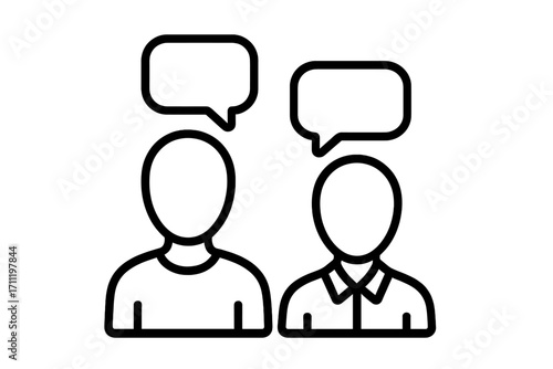 © Delora, Fototapeta premium Two people talking icon. Communication, dialogue concept. Vector line art of faceless persons with speech bubbles. Business discussion, chat, meeting, or feedback symbol.