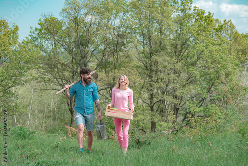 © Volodymyr, Obraz premium Two people walking in agricultural field. Earth day. A pair of farms working in the garden. Couple Farmers. Wife and husband planting in the vegetable garden.