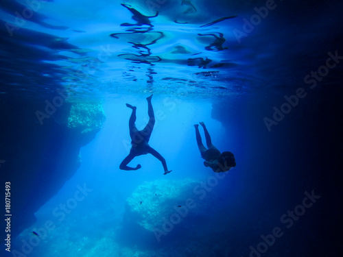 © Mathia, Fototapeta premium Two persons dive into the blue water