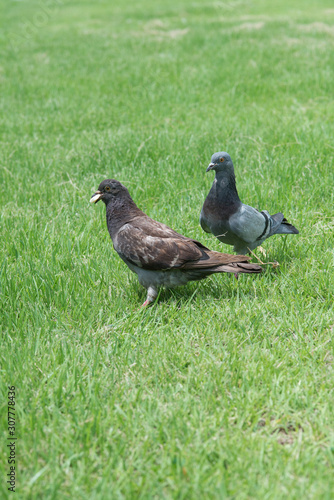 © MyungJin, Obraz premium Two pigeons on lawn green grass in park.