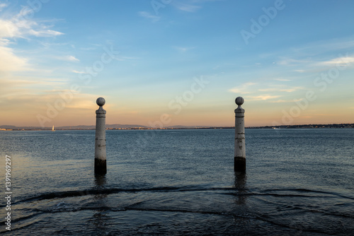 Fototapeta premium Two pillars in the river. Access point to Lisbon.