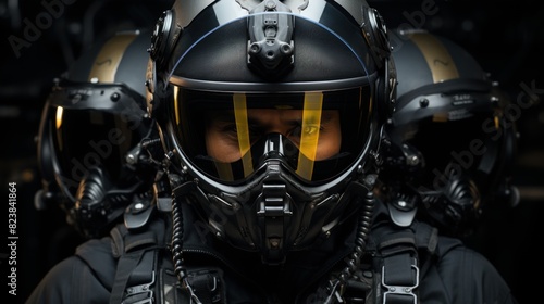 © AS Photo Family, Fototapeta premium Two pilots wearing full gear with helmets and visors down, standing in a dark setting