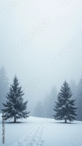Naklejka premium Two pine trees are standing in a snow covered field. The sky is overcast and...