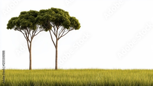 Fototapeta premium Two Pine Trees in a Yellow Flower Field Against White Background