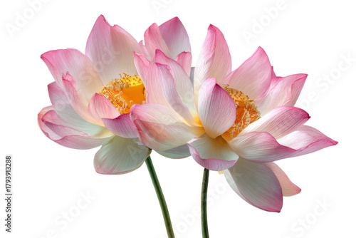 © PNG House, Fototapeta premium Two pink and white lotus flowers with yellow centers on black background image, Isolated On Transparent Background, Png Cut Out