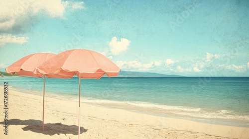 © anita, Fototapeta premium Two pink beach umbrellas on a sandy shore.