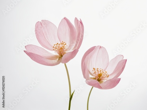 © Dmitriy K., Naklejka premium Two pink cosmos flowers bloom against a white background