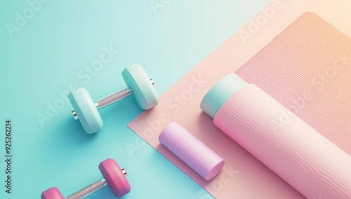 Fototapeta premium Two pink dumbbells and a pink yoga mat.