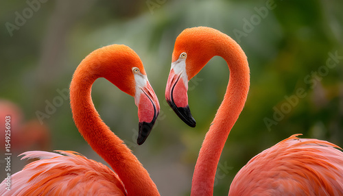 © Oleksiy, Obraz premium Two pink flamingos forming heart shape with necks. Birds in love, romance, affection. Exotic birds in nature, animal wildlife, pink feather details