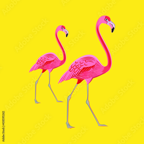 Fototapeta premium Two pink flamingos on a yellow background, vector illustration