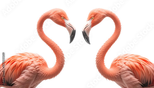 © ridho, Obraz premium Two pink flamingos standing together against a white background. Graceful birds with long legs and curved necks, ideal for nature, wildlife, or tropical-themed design projects.