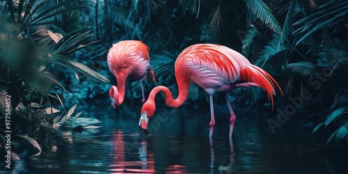 © StockUp, Fototapeta premium Two pink flamingos wade gracefully in a tranquil water body, surrounded by lush vegetation, symbolizing grace and nature's beauty.