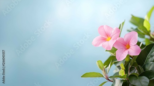 Fototapeta premium Two Pink Flowers on a Branch Against a Light Blue Background