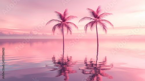 © Thiago, Naklejka premium Two pink palm trees over the sea. generative ai. Dreamlike Skyline Reflections. Illustration