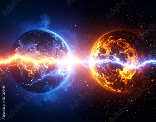 Obraz premium Two planets collide, energy crackling between them. One is fiery, the other icy