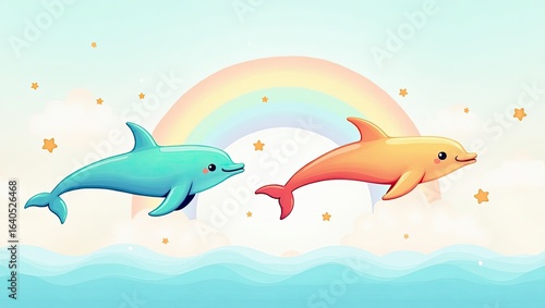 © Zamrud, Fototapeta premium Two playful dolphins leap through the sky.