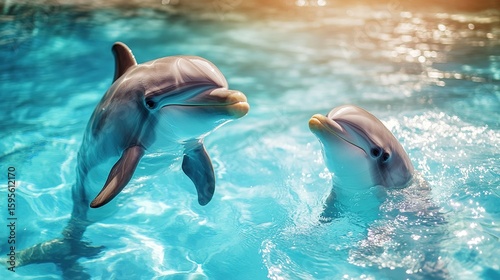 Obraz premium Two playful dolphins swim and leap gracefully in clear, sunlit turquoise...