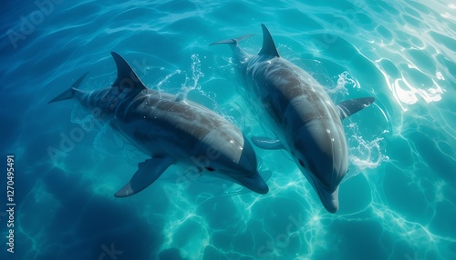 Fototapeta premium Two playful dolphins swimming together in crystal-clear turquoise ocean...