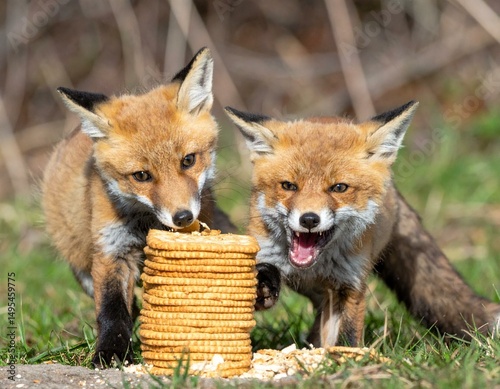 © stylub, Fototapeta premium Two playful foxes enjoying a stack of delicious snacks in a sunny outdoor setting.
