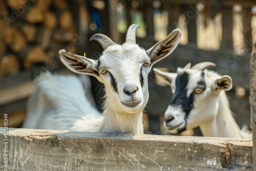 Fototapeta premium Two playful goats looking over a wooden fence at a farm