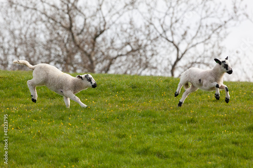 © Andrew Ward, Obraz premium Two playful lambs leaping and jumping on a grassy hill in spring countryside with blurred trees in background