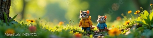 © FirstJaravee, Fototapeta premium Two playful raccoon figurines explore a vibrant flower-filled meadow.