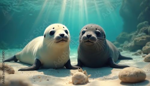Fototapeta premium Two playful seals, one light, one dark furred, rest on sandy ocean floor bathed in soft underwater sunlight. Gentle rays filter through clear turquoise water, illuminating marine life, rocky reef