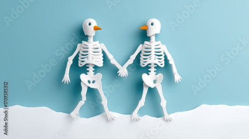 Fototapeta premium Two playful skeletons hold hands against a blue backdrop, featuring whimsical bird-like heads and a snowy base, creating a quirky, light-hearted scene.
