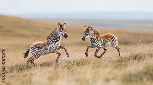 Fototapeta premium Two playful zebras frolic in a grassy field under a clear sky, showcasing...