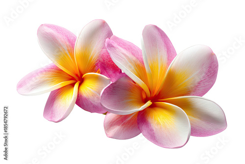 © Noval, Fototapeta premium Two plumeria blossoms, pink-white petals, golden centers on black backdrop