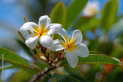 © Albashirah, Fototapeta premium Two plumeria blossoms, white with yellow centers, vibrant green leaves