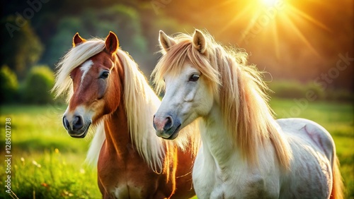 © Oliver, Fototapeta premium Two Ponies Gazing Sideways: White and Brown Horse Stock Photo