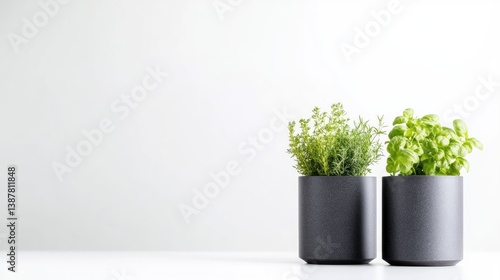 Fototapeta premium Two potted herbs sit on a white surface against a white background. The dark gray cylindrical pots contain thyme and basil. The image is well-lit, high-resolution, and minimalist in style. Muted gr