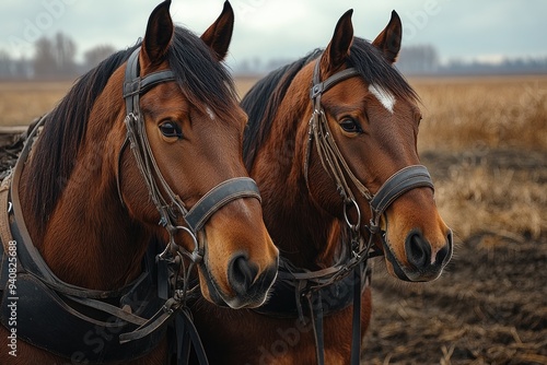 © kardaska, Obraz premium Two powerful brown horses wearing harnesses standing on farm