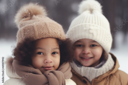 © lanych, Obraz premium Two pretty afro-american girs in winter walking outdoors. Generative AI