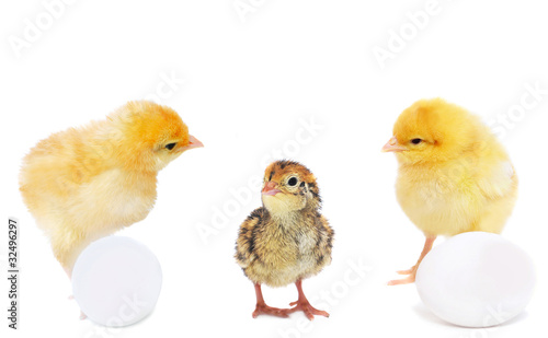 © gb, Fototapeta premium two pretty chickens with eggs and little quail