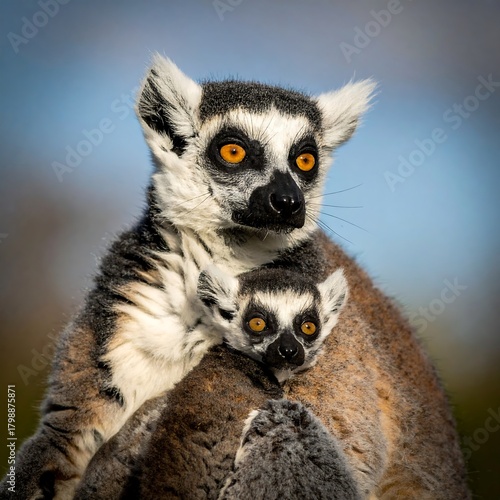 © Raf, Obraz premium Two primates with ringed tails, one cuddling the other, against a blurred background. Warm sunlight illuminates their fur and large eyes