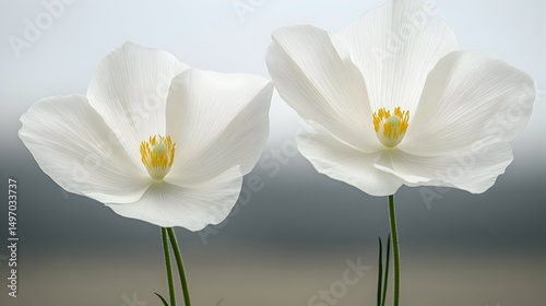 Fototapeta premium Two pristine white cosmos flowers, delicate petals, subtle yellow centers, against a soft, blurred gray-beige background