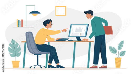 © Artisan, Fototapeta premium Two professional men collaborating in an office, discussing data on a computer screen. Ideal for business, teamwork, and modern office concepts.