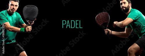 © Mike Orlov, Fototapeta premium Two professional padel players with rackets on fire background. Open social tournament template.