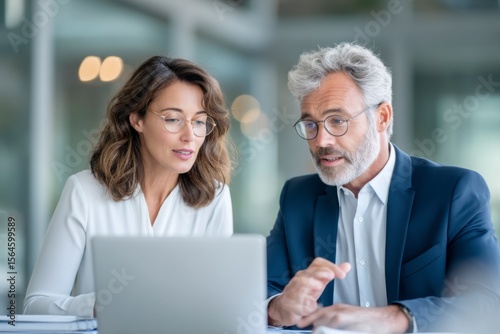 © Tenalxp, Obraz premium Two professionals, a man and a woman, collaborate and discuss work while looking at a laptop in a modern office setting.