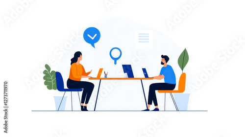 Obraz premium Two professionals collaborate at a table, using laptops, surrounded by plants, with icons indicating communication and time management.