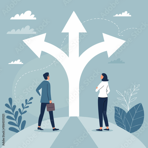 © Sohana, Obraz premium Two professionals considering multiple directional choices in a conceptual flat vector illustration