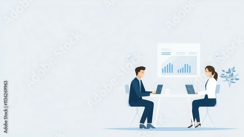 © Eman Suardi, Obraz premium Two professionals discussing data at a table with laptops and a chart in the background.