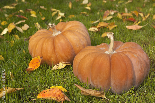 Fototapeta premium Two pumpkins on green gras with fallen leafs