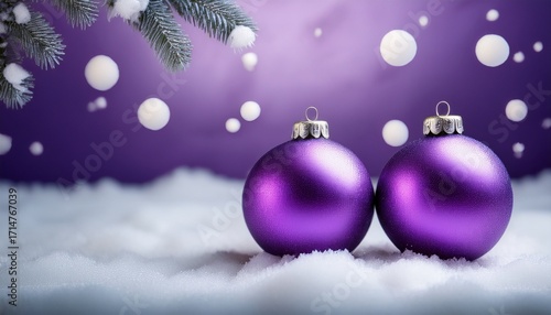 Fototapeta premium Two Purple Christmas Ornaments Resting On A Snowy Surface