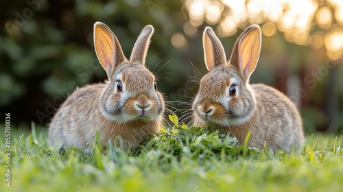 Fototapeta premium Two rabbits enjoy fresh grass at sunset in a serene garden setting