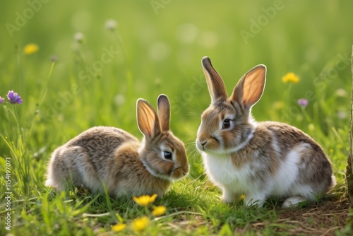 Fototapeta premium two rabbits sitting in the grass next to a tree