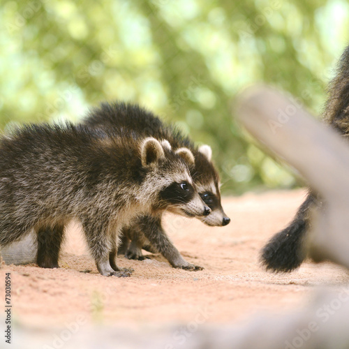 © dangdumrong, Fototapeta premium Two Raccoon baby fallow mom